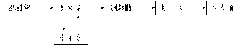 废气经收集系统收集后,汇总进入喷淋塔,在喷淋塔中,与逆流而下的碱液接触,完成酸等污染物的吸收,也可去除部分有机污染物,通过塔顶的除雾器后,进入吸附器,通过活性炭的吸附作用,将废气中残余的有机污染物。处理达标的废气经引风机的加压后,由排气筒高空排放。