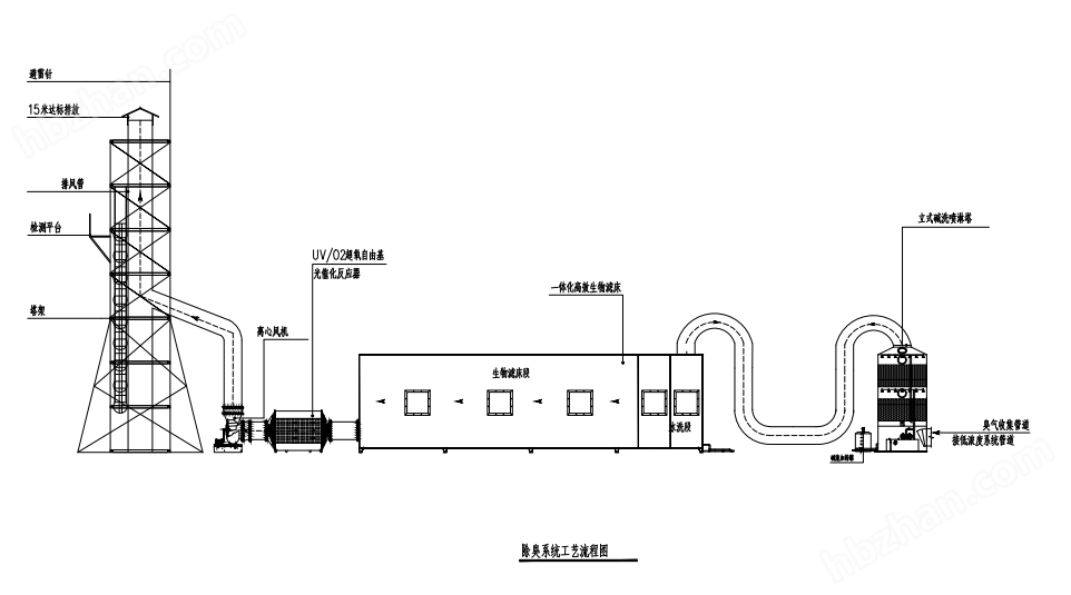 在餐厨垃圾处理运营的过程中产生的臭气气体,由离心风机牵引,通过风管将臭气输送至处理单元净化,以达到环保排放的目标。